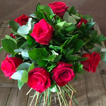 A lovely bouquet of 12 Roses with Eucalyptus and complementing foliage in colour options of red, yellow, pink and white.